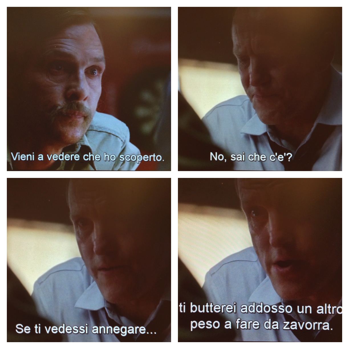 Nel quarto episodio (“Who Goes There”) Marty/Harrelson incontra lo sceneggiatore Marc Pizzolatto. Lui sta seguendo una pista e chiede al barista. Il barista è Pizzolatto. Marty fa le sue domande, Pizzolatto è reticente. Allora in detective fa il duro, minaccia di chiudere il locale ma poi dice quasi scandalizzato della banalità da detective televisivo che ha appena pronunciato esclama: “Ma che parole mi metti in bocca?”. Be’, detta allo sceneggiatore principe della serie, la cosa a me ha fatto ridere, ridere forte.