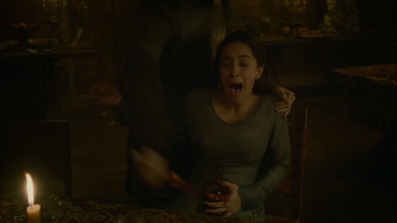 Nei confronti della sposa del giovane lupo Robb Stark, creatori e sceneggiatori della serie sono stati anche più crudeli dello stesso Martin. Nei libri la ragazza si salva (anche se in effetti si tratta di tutto un altro personaggio, Jeyne Westerling), ma in Game of thrones la bella Talysa di Volantis, incinta del re del nord, si becca una coltellata proprio nel ventre che porta il frutto del suo amore con l’erede di Ned Stark. Nel mio carminio ricordo delle Nozze Rosse è senz’altro uno dei momenti più terribili.