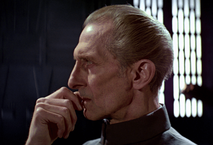 Il signor Peter Cushing era celebre per aver partecipato a molte produzioni horror della Hammer nei panni di Van Helsing o Viktor Frankenstein o anche come un ottimo Sherlock Holmes. Il suo tono british di algida indifferenza ai temi della vita e della morte lo resero un perfetto Governatore Tarkin, l’uomo che ordinò il totale annientamento di Alderaan solo perché la base ribelle indicata da Leia era troppo lontana e c’era traffico, il Raccordo è sempre bloccato. Era il 1977 anno in cui Cushing aveva già deciso di non indossare mai gli stivali ed ecco perché in Guerre Stellari non c’è una sua inquadratura dalla testa ai piedi